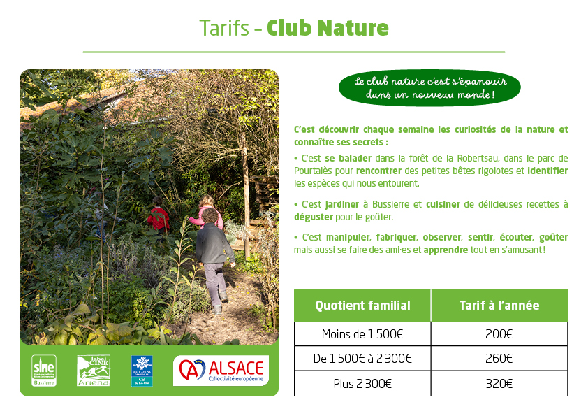Le Club Nature a lieu tous les mercredis après-midi, du 17 septembre au 24 juin, hors congés scolaires, de 14h30 à 17h30.